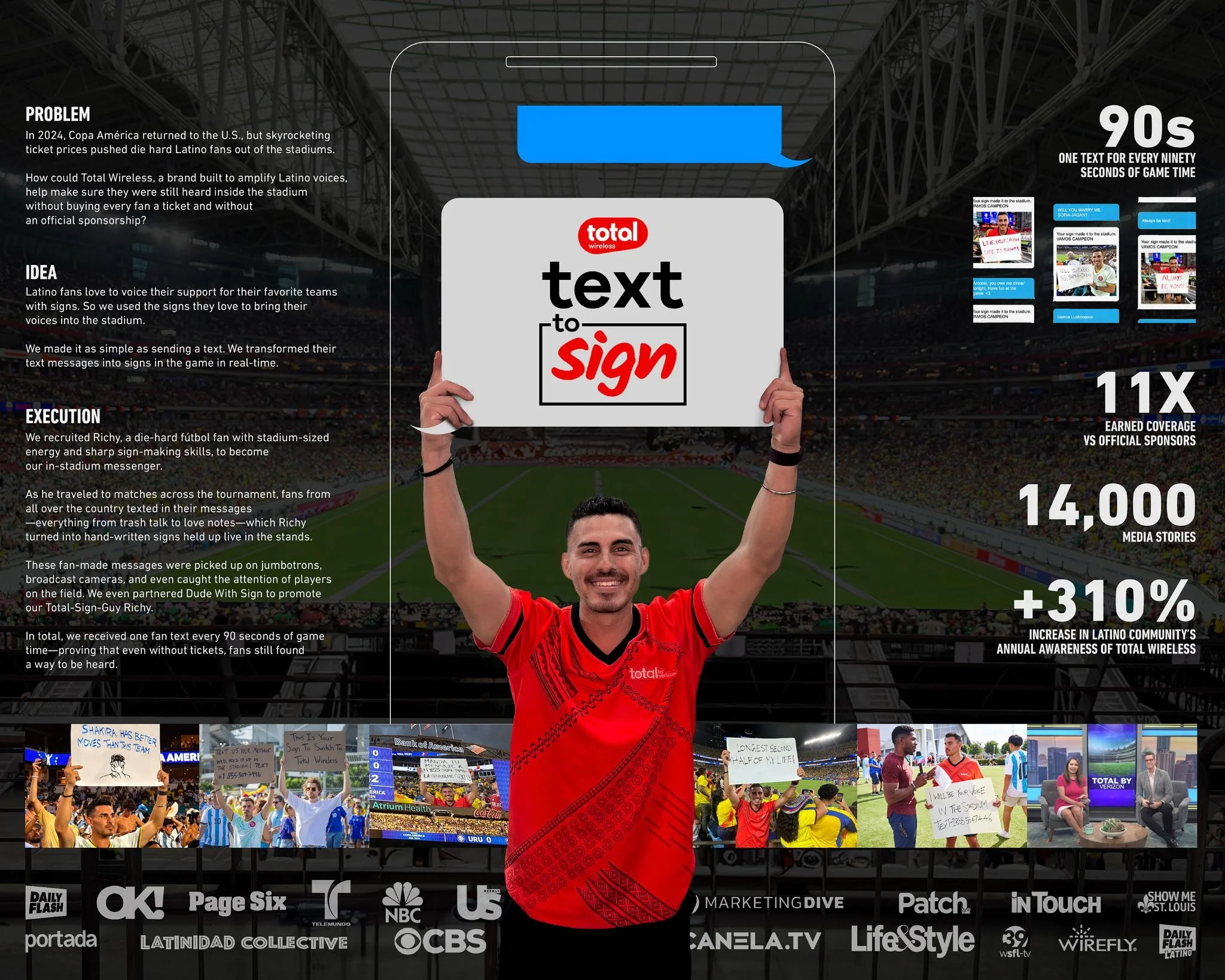 When Copa América ticket prices soared, many passionate fans were priced out. Total Wireless stepped in, giving real Latino fans a voice without official sponsorship. Fans texted messages displayed live by our "Sign Guy," creating one fan text every 90 seconds and earning 11 times more coverage than official sponsors.